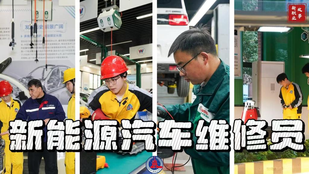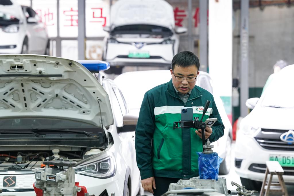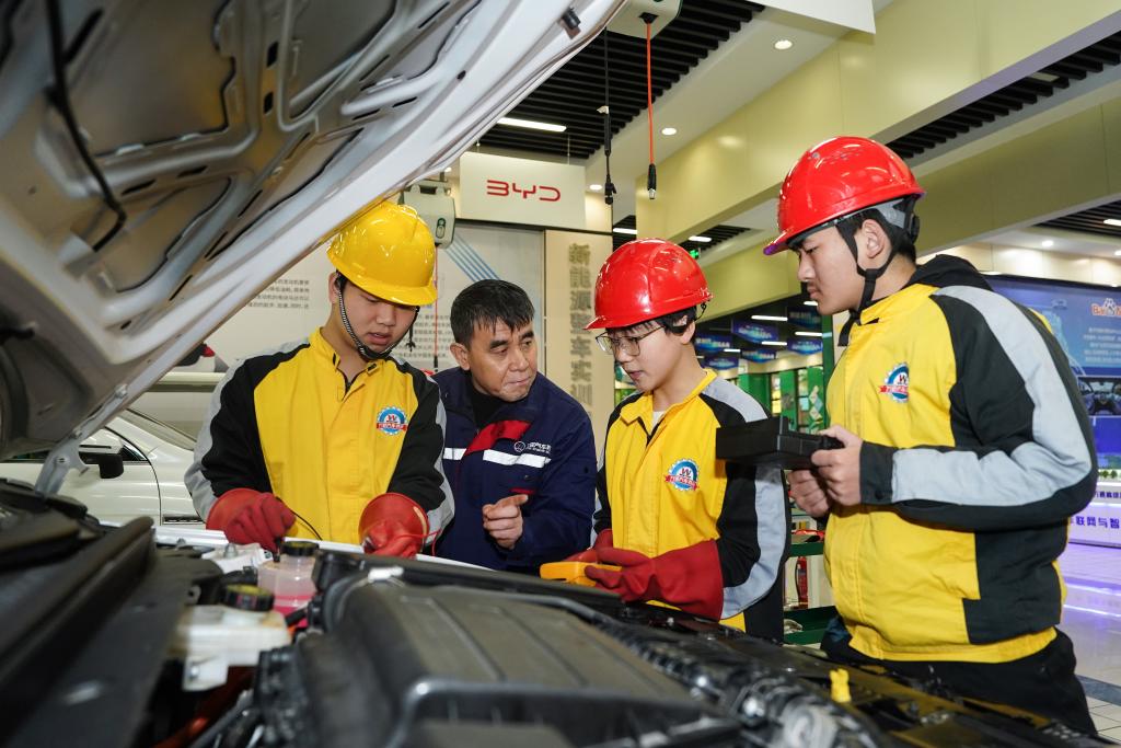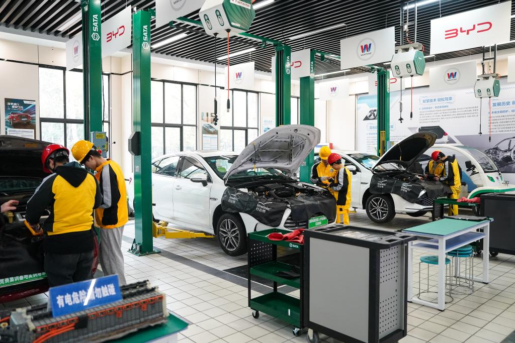 安徽万通技师学院智能网联汽车工程专业学生在学校新能源汽车实训中心内学习。