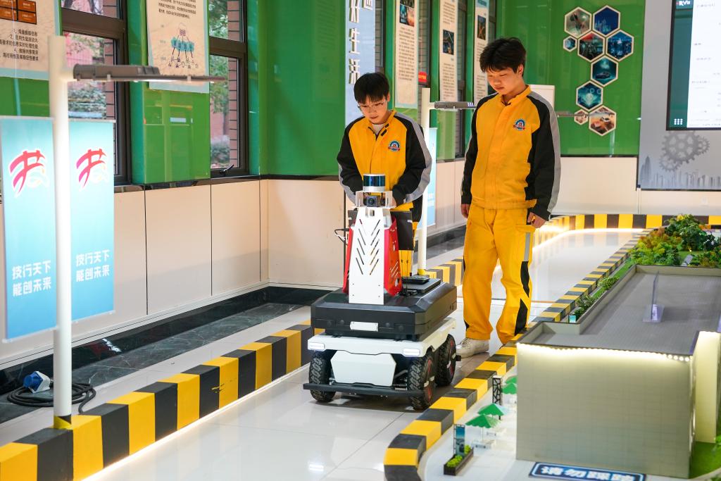 郑飘雪(左)、王文韬在学校车联网与智能交通展示中心调试自动驾驶车辆。