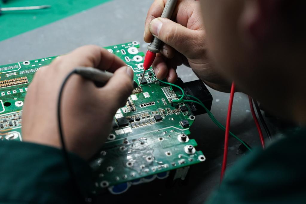 郑飘雪(中)、王文韬在老师时海峰的指导下学习检测新能源汽车电池压差。