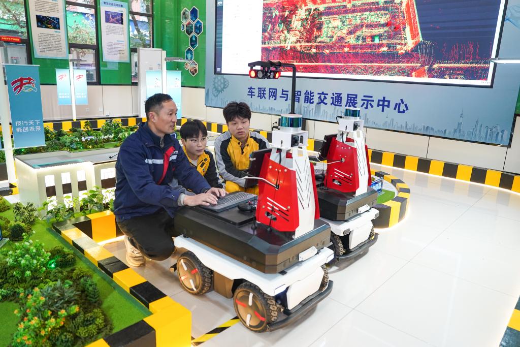 郑飘雪(中)、王文韬(右)在老师汪贵的带领下学习调试自动驾驶车辆。