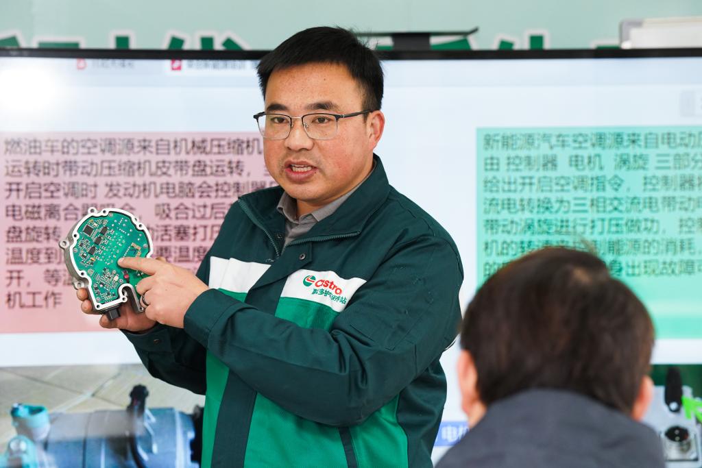 郑飘雪(左)与同学王文韬(右)在老师时海峰的指导下熟悉新能源汽车基本结构。