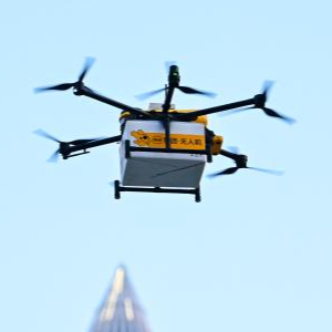 送餐无人机穿行在深圳市后海片区的楼宇之间。新华社记者 毛思倩 摄
