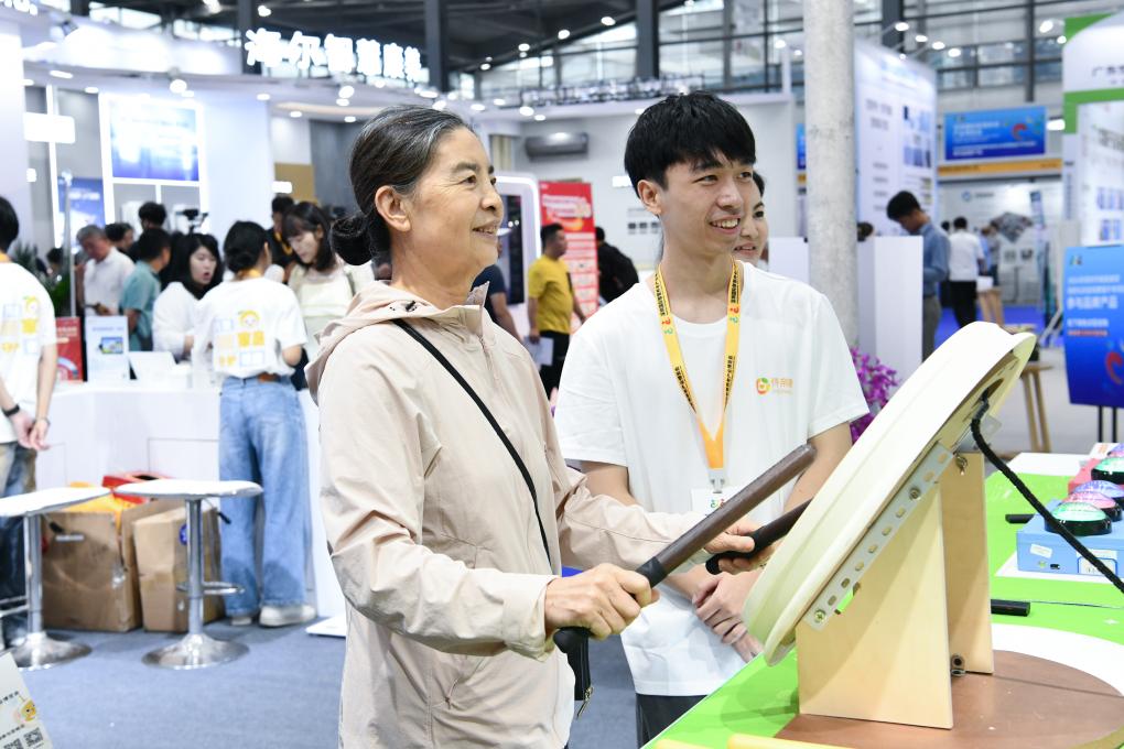 10月27日,老人在2024深圳国际智慧养老产业博览会上体验乐龄鼓。(新华社记者 梁旭 摄)