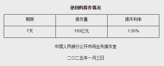 据央行网站消息,为保持银行体系流动性充裕,2025年1月3日中国人民银行以固定利率、数量招标方式开展了193亿元逆回购操作。具体情况如下: