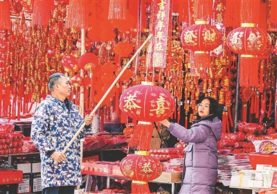 最近,广西南宁市各种灯笼、福字、春联等传统春节饰品供应增多,其中许多产品销往东南亚市场。图为商家在年货市场整理灯笼。喻湘泉摄(人民视觉)