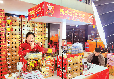 日前,北京新发地第三届年货节开幕。消费者不仅可以在现场选购,还可以通过官方电商账号获得便捷的线上购物体验。图为销售人员在直播介绍一款进口自智利的车厘子。记者 潘俊强摄