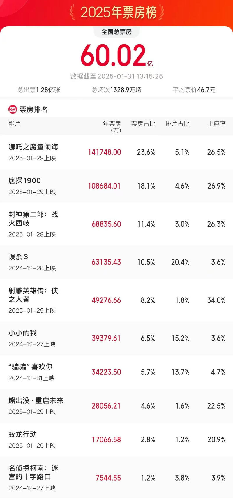 《哪吒之魔童闹海》暂列年度票房榜首位
