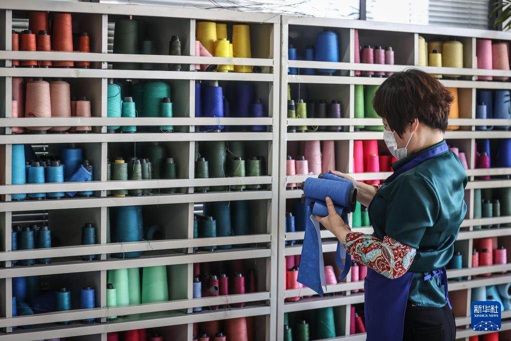 2021年4月7日,工作人员在葫芦岛斯达威集团泳装制样车间挑选材料。新华社记者 潘昱龙 摄