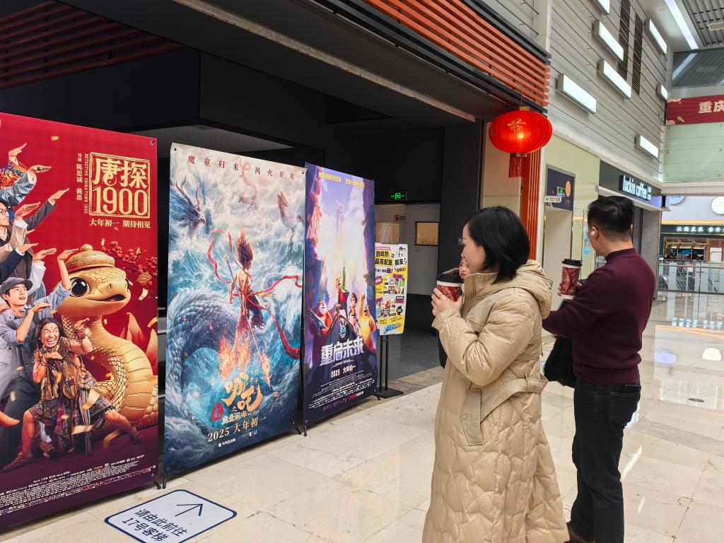 市民在成都市一家电影院外观看电影海报。新华社记者李倩薇 摄