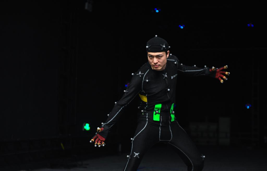 2024年8月28日,在深圳的一个动捕基地,动捕演员利用肢体动作展现《黑神话:悟空》游戏角色特点。新华社记者 毛思倩 摄