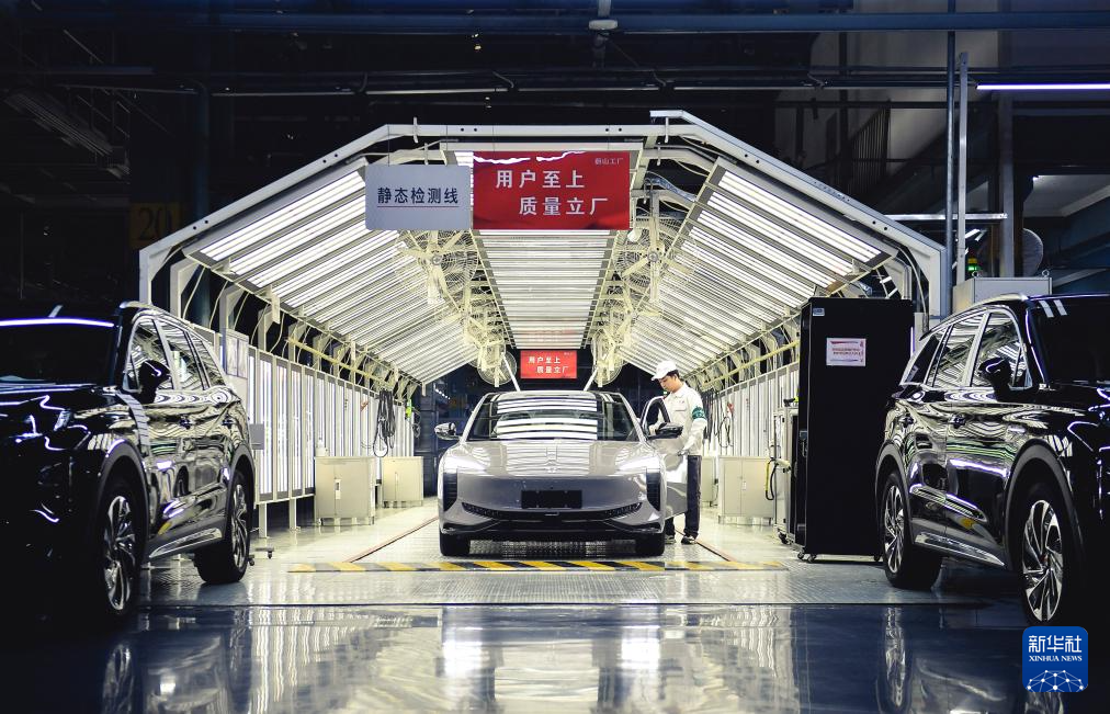 2024年4月24日,工作人员在位于吉林长春的中国一汽红旗制造中心蔚山厂区总装车间内,对生产的一汽红旗EH7新能源汽车进行静态检测。新华社记者 许畅 摄