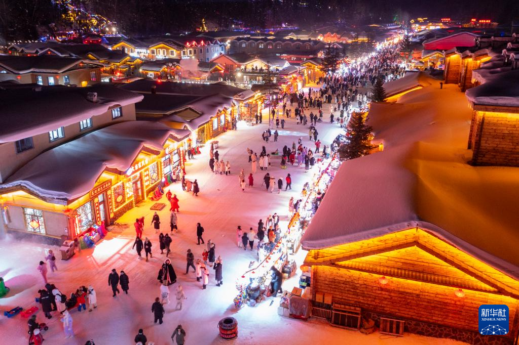 2025年1月24日,游客在牡丹江市“中国雪乡”景区雪韵大街游玩(无人机照片)。新华社记者 谢剑飞 摄