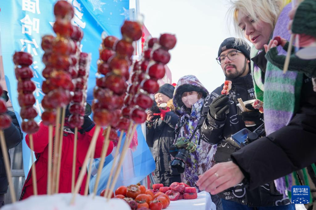 2024年12月7日,外国游客在第五届哈尔滨采冰节现场品尝冻货。新华社记者 王建威 摄