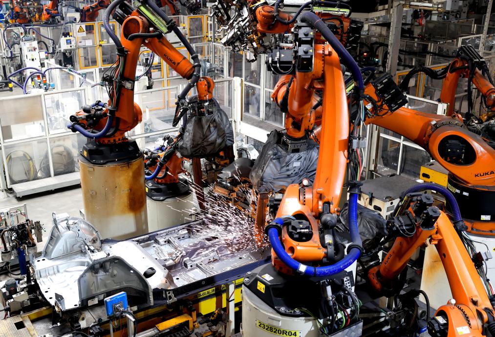 3月12日,在位于青岛汽车产业新城一家车企的焊装车间,机器人进行焊接作业。新华社发(梁孝鹏摄)