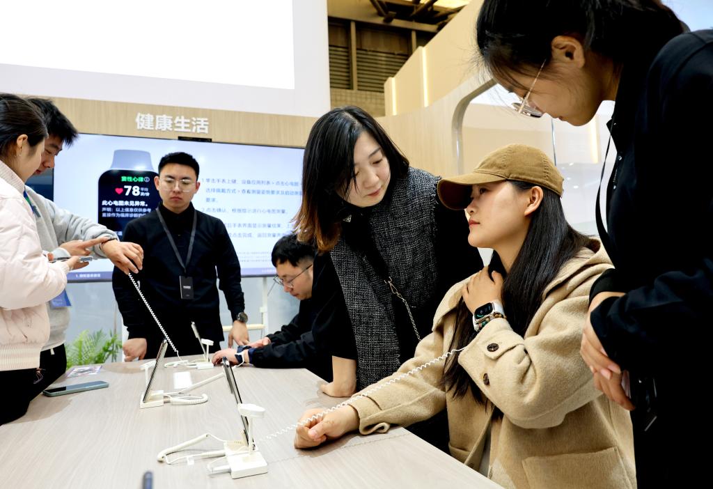 3月20日,一位参观者(右二)在体验智能手表的腕部动态血压记录仪功能。新华社记者 方喆 摄