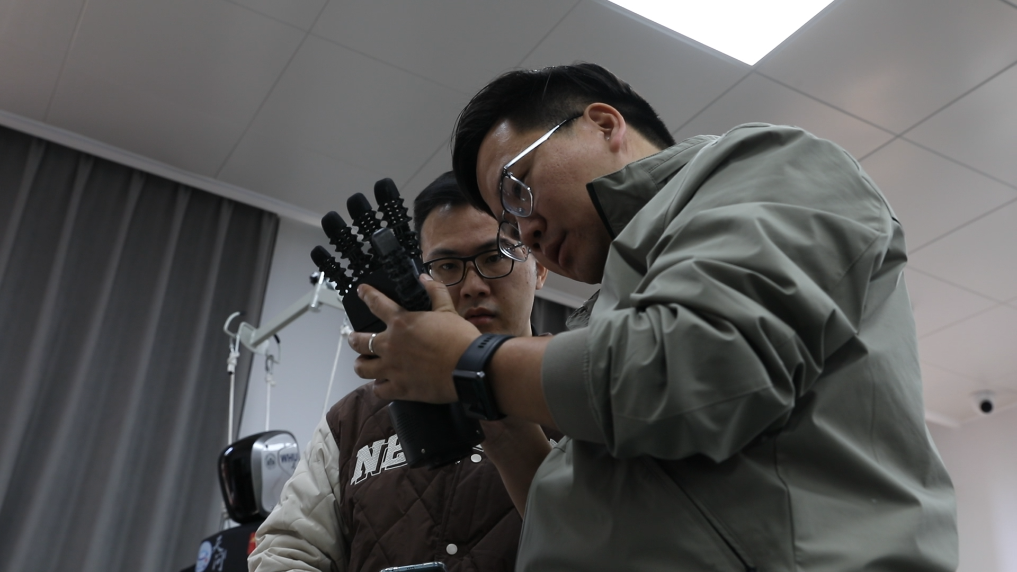 李淼(右)在和团队成员调试机器人灵巧手。新华社记者 潘志伟 摄
