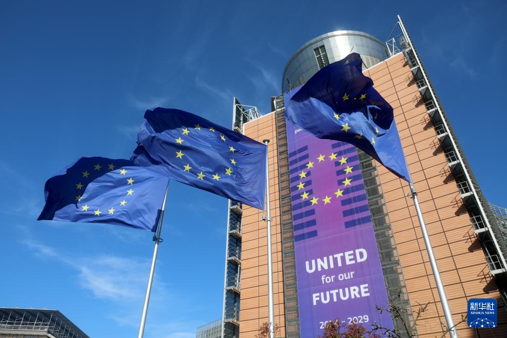 这是4月2日在比利时布鲁塞尔欧盟总部外拍摄的欧盟旗帜。新华社记者 赵丁喆 摄