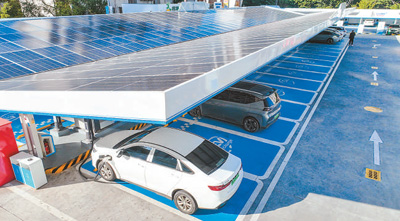 浙江杭州梧桐路“光储充检”智慧能源综合示范超级充电站于近期投入运营。该超充站拥有64个充电车位,并配备了一个可实现汽车与电网双向能量流动的V2G反向充电桩。龙 巍摄(人民视觉)