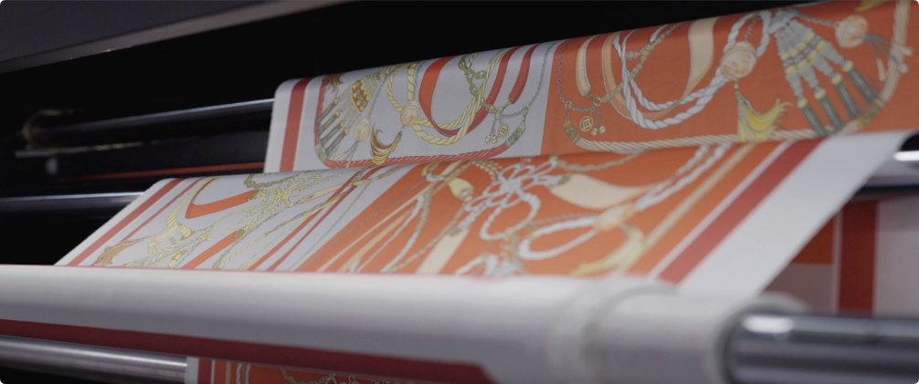 走进位于杭州市钱塘区的万事利丝绸工业园区,厂房里矗立着一台台方方正正的免水洗印染一体机。机器几乎无声地滑动着,显示屏里展示着机器正在打印的印花,最快仅需半小时,原本投入的一块白色坯布,便能化为一方印花精美的丝巾面料。