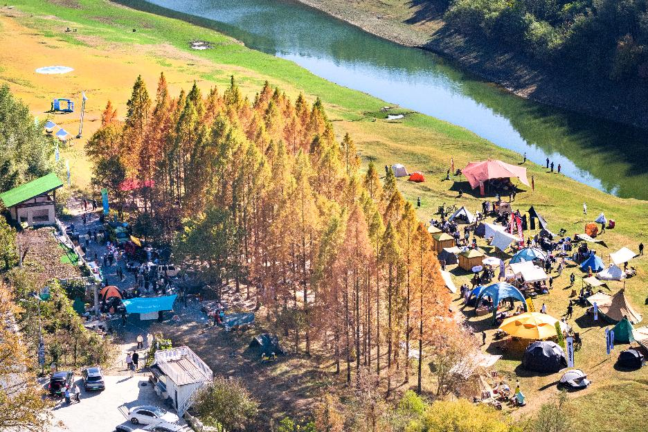 游客在安吉夏阳村的露营地里休闲游玩(2024年11月30日拍摄,无人机照片)。新华社发(潘学康摄)