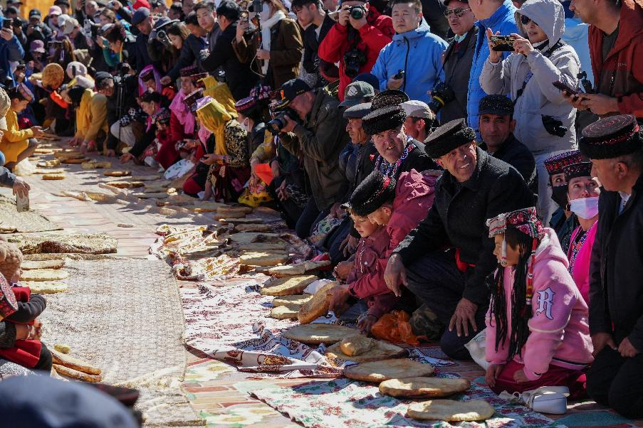 2025年3月22日,在新疆塔什库尔干塔吉克自治县“彩云人家”民俗村,当地村民与观众分享食物。 新华社记者 徐宏岩 摄