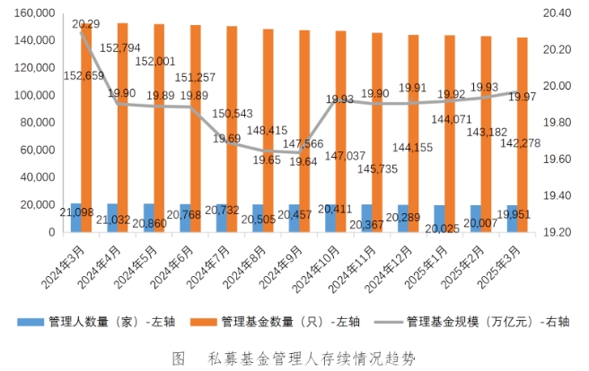 截至2025年3月末,存续私募基金142278只,存续基金规模19.97万亿元。其中,存续私募证券投资基金85614只,存续规模5.25万亿元;存续私募股权投资基金30177只,存续规模10.96万亿元;存续创业投资基金25613只,存续规模3.39万亿元。(记者 刘羽佳)