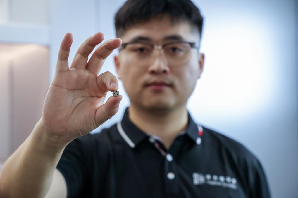 4月24日,在位于河套深港科技创新合作区内的香港科学园深圳分园,华力创科学联合创始人鱼晨展示直径仅8.5毫米的微传感器。新华社记者 梁旭 摄
