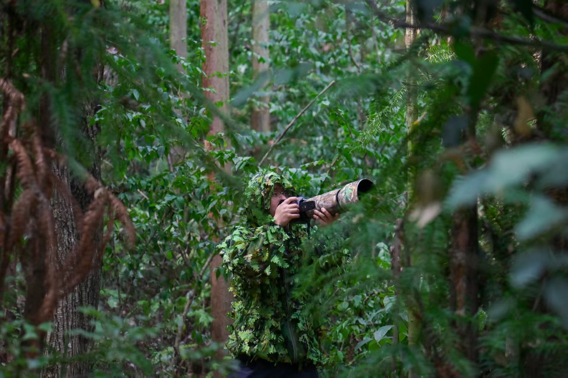 郭康身着伪装服,在森林里观鸟。新华网发(受访者供图)