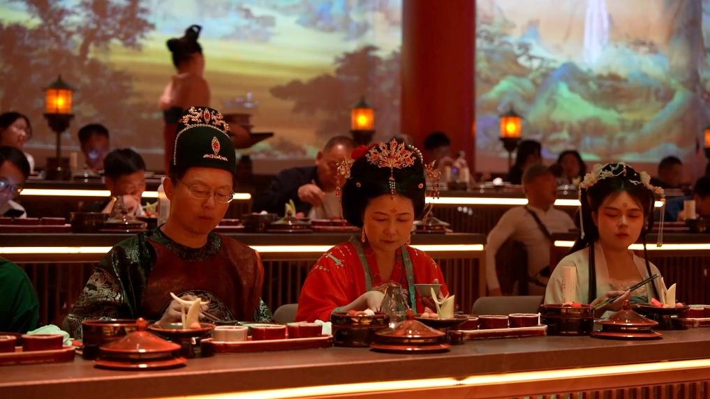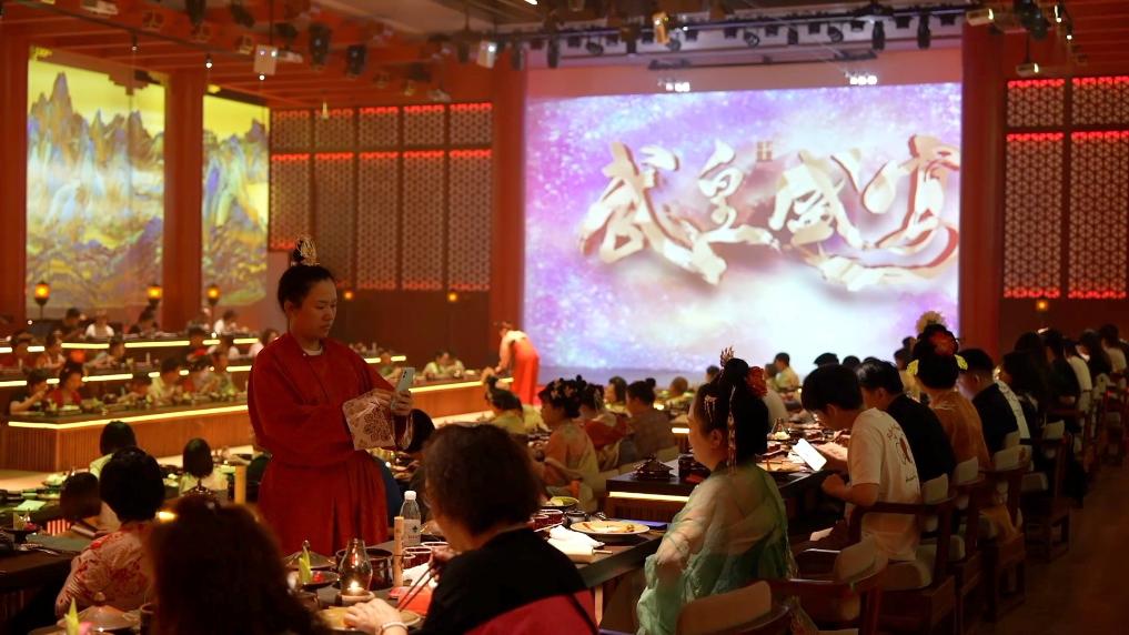 洛阳打造的"武皇盛宴"项目,将武则天故事与牡丹、龙门石窟等元素完美融合。通过全息投影、巨幅水幕等科技手段,让游客在品尝美食的同时穿越回大唐盛世。十三坊特色街区还设有"妆造司",游客可换上汉服沉浸体验,三家门店场场爆满,需提前一周预约。