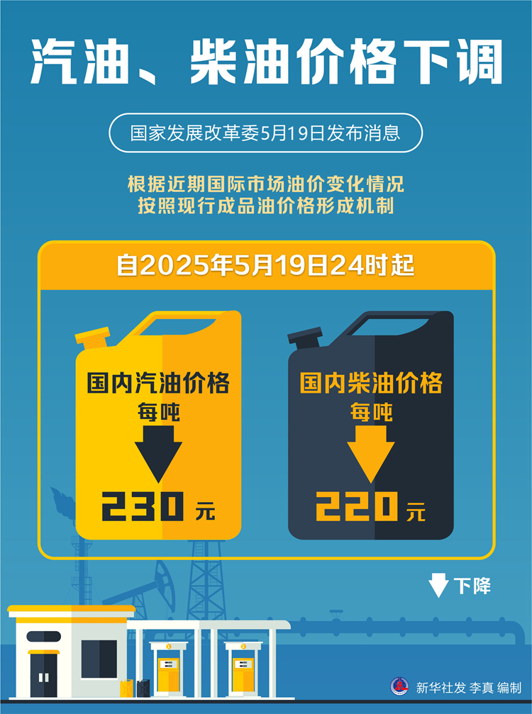 新华社北京5月19日电(魏玉坤、李沛原)国家发展改革委19日发布消息,根据近期国际市场油价变化情况,按照现行成品油价格形成机制,自5月19日24时起,国内汽、柴油价格每吨分别降低230元和220元。