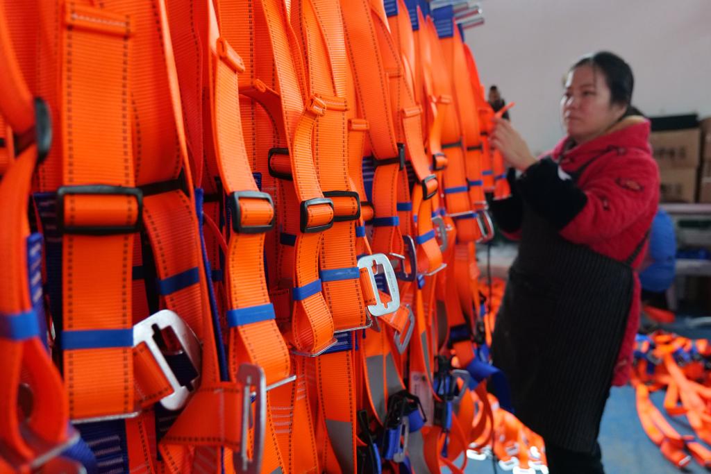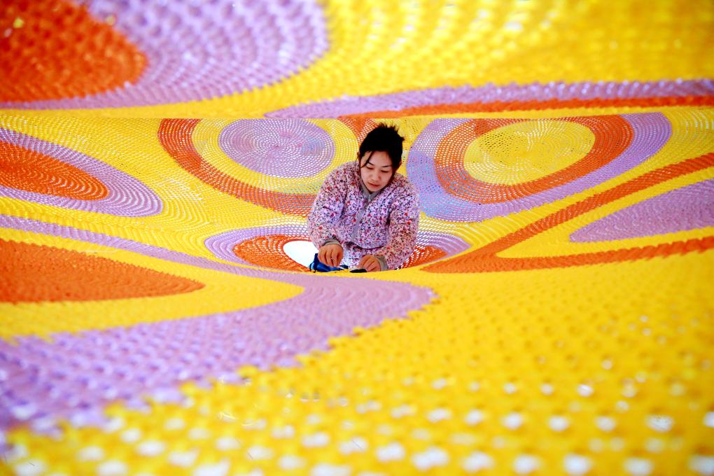 在山东滨州惠民县绳网产业园,工作人员正整理绳网产品。新华社记者 冯媛媛 摄