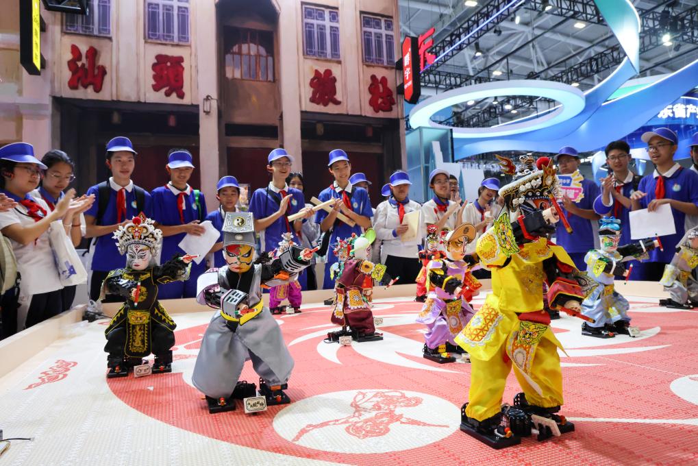 5月23日,学生在文博会上观看机器人表演英歌舞。新华社记者 梁旭 摄