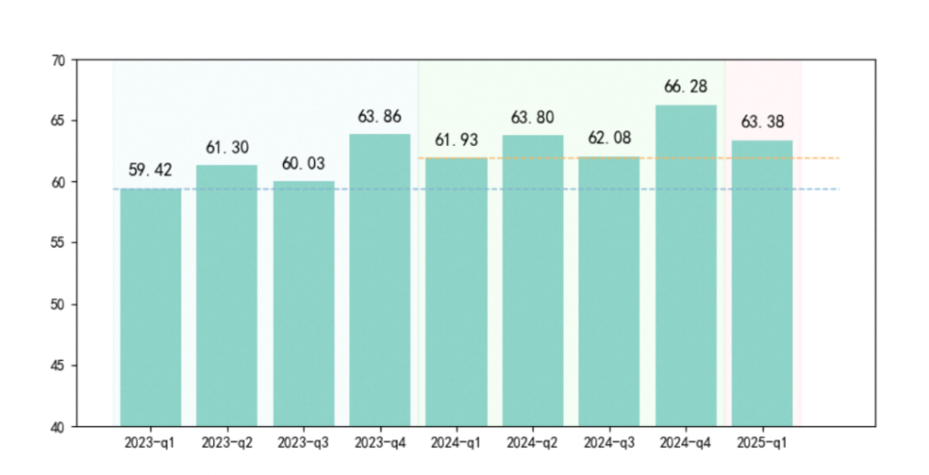 报告数据显示,2023年一季度到2025年一季度,中国线上消费品牌指数(CBI)从59.42升至63.38,2025年一季度相较基期指数增加6.7个百分点,表明我国消费品质显著回升。