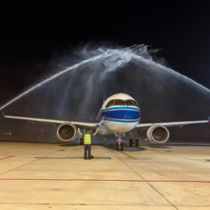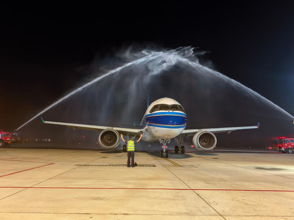6月4日晚,中国南方航空CZ3383航班顺利抵达南阳姜营机场,国产大飞机C919完成支线机场商业首航。新华社发(陈阳摄)