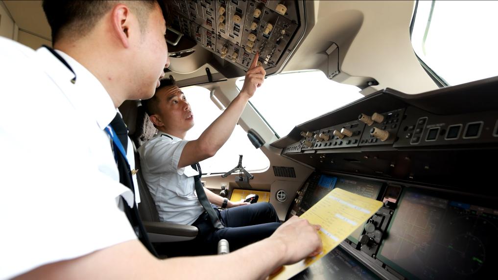 6月5日,在南航南阳基地的一架C919飞机驾驶舱内,飞行员正在开展飞行训练。新华社发(王胜利 摄)