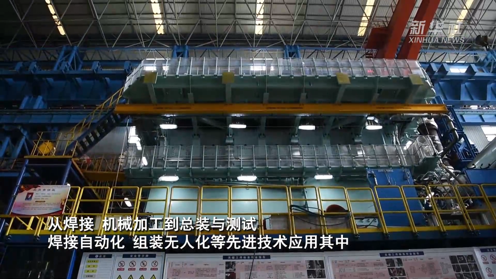 位于青岛西海岸新区的中船发动机生产车间内,一台四五层楼高的船舶发动机正在安装。从焊接、机械加工到总装与测试,焊接自动化、组装无人化等先进技术应用其中。