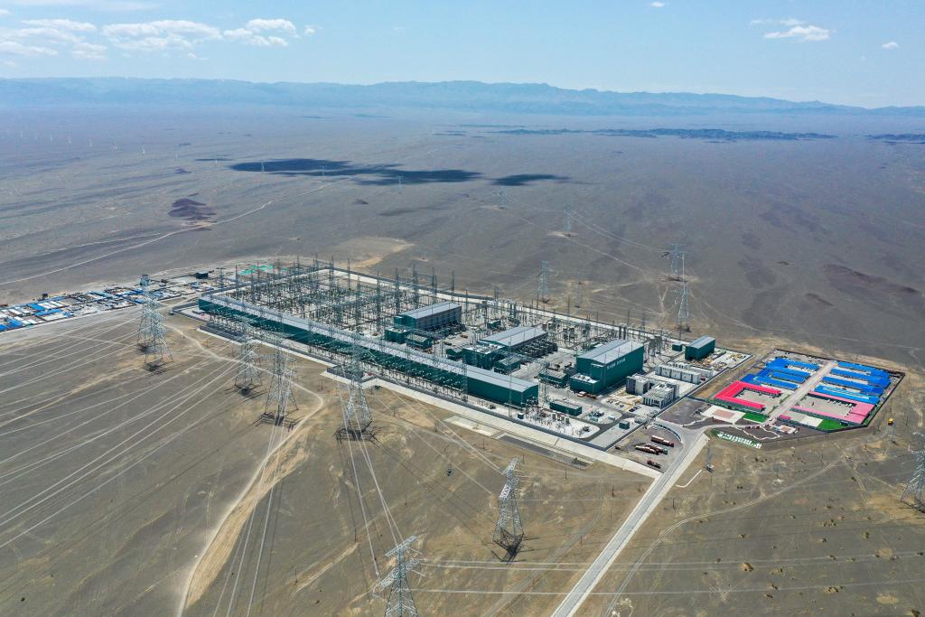 这是6月10日拍摄的哈密-重庆±800千伏特高压直流输电工程的送端站巴里坤换流站(无人机照片)。新华社记者丁磊 摄