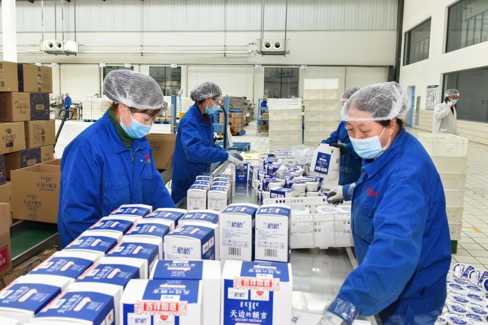 工人在内蒙古兰格格乳业有限公司酸奶生产车间将酸奶产品装箱。(受访者供图)