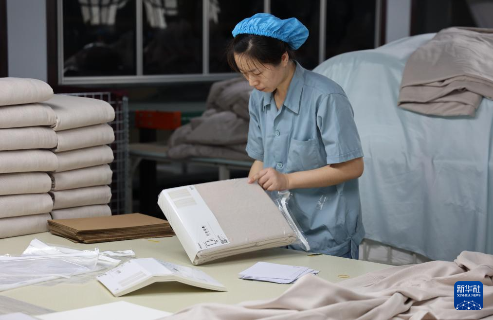 6月16日,在山东滨州高新区小营街道的一家纺织企业生产车间内,工人加紧赶制纺织品的海外订单。5月份,货物进出口总额38098亿元,同比增长2.7%。新华社发(初宝瑞摄)