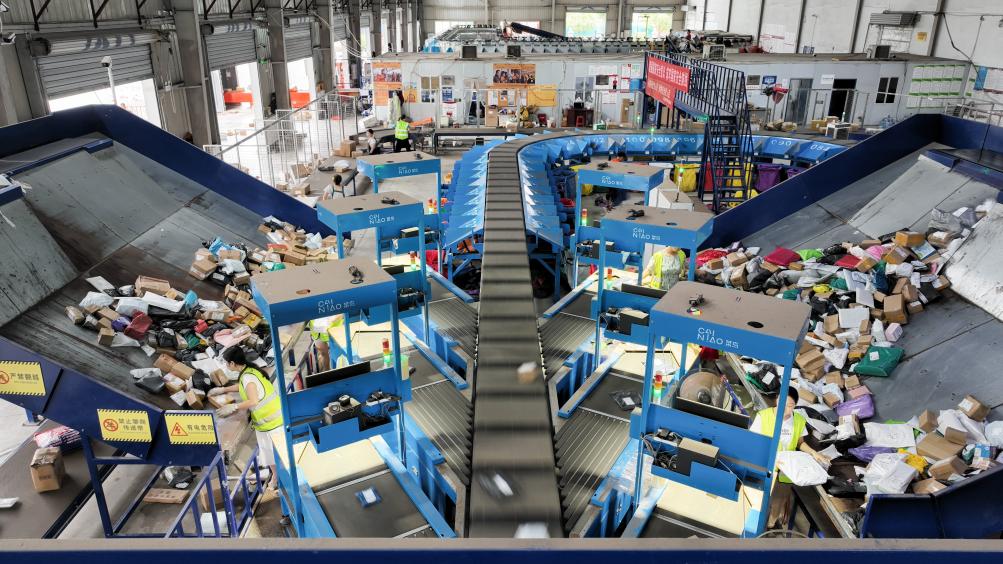 6月18日,在重庆市秀山土家族苗族自治县武陵现代物流园区快递分拨中心,工作人员在智能快递分拣流水线上作业(无人机照片)。新华社发(胡程摄)