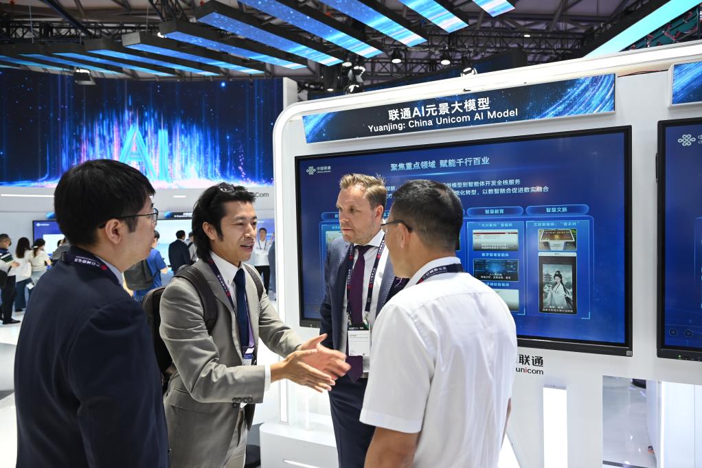 6月18日,中外观众在中国联通展台洽谈。新华社记者 陈爱平 摄