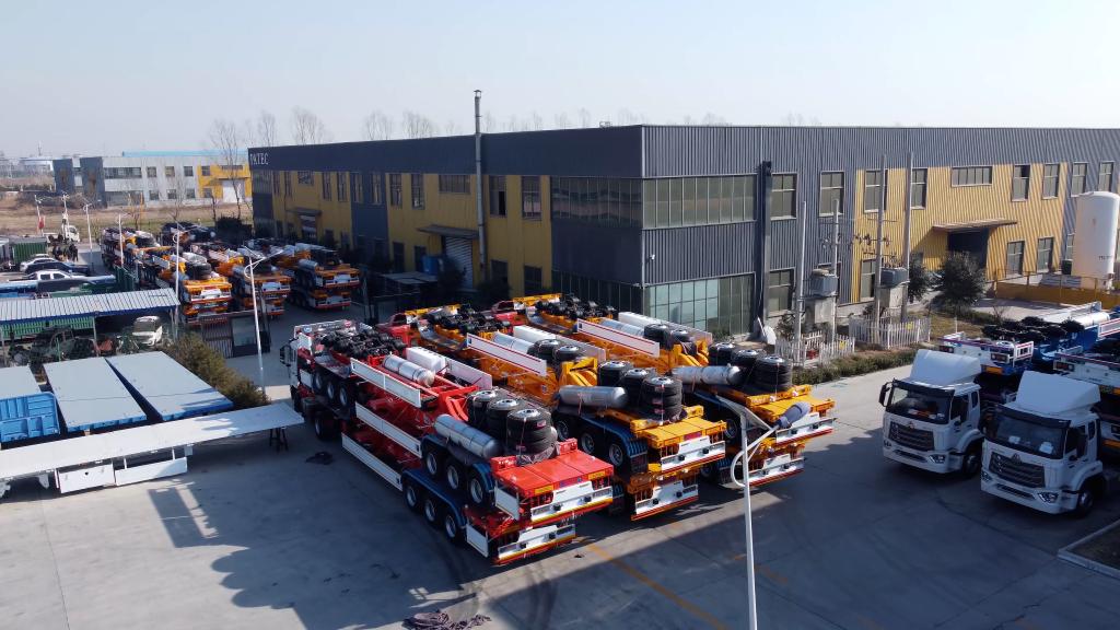 在建星专用车制造有限公司的厂区内,一批崭新的集装箱平板半挂车整装待发。(受访者供图)