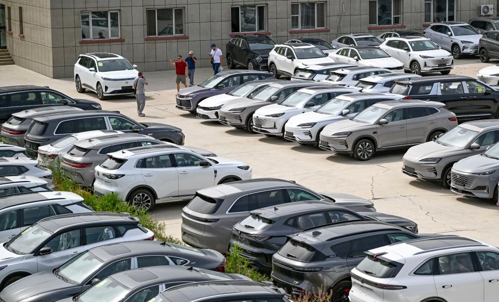 在新疆霍尔果斯一家汽车贸易公司,外国客商在室外仓库了解情况(6月10日摄)。新华社记者 陈朔 摄