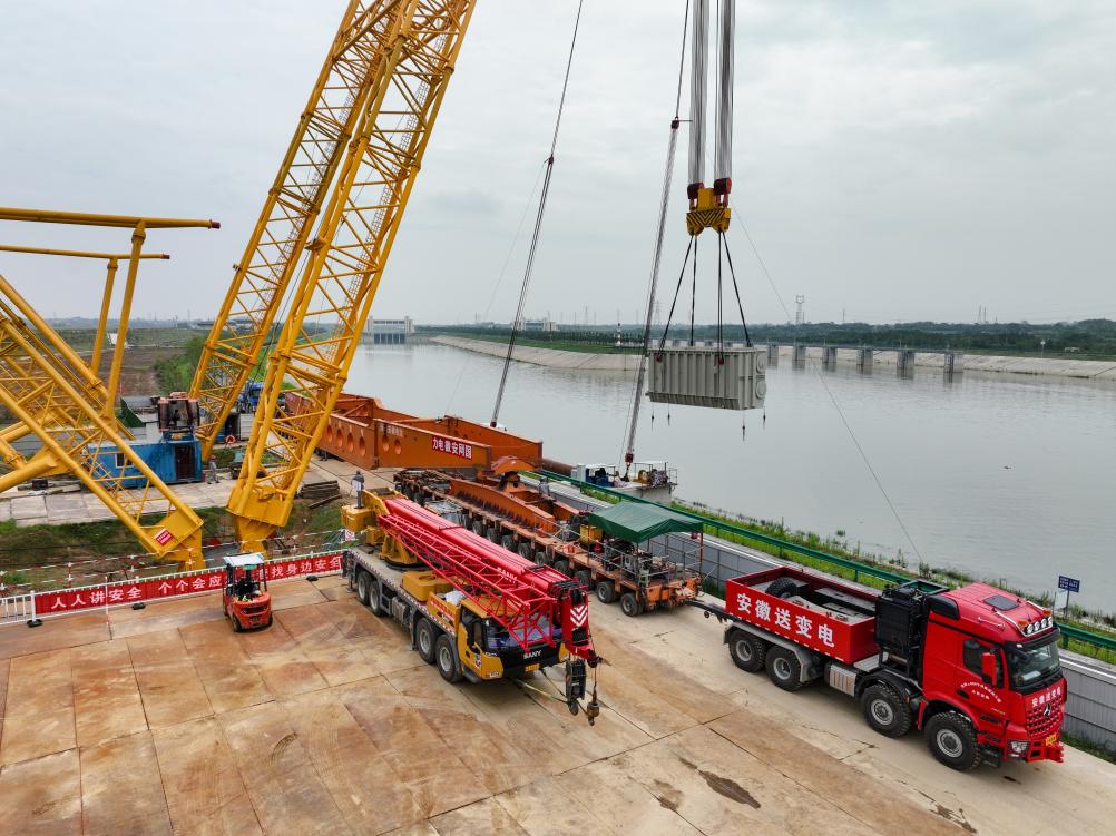 6月25日,±800千伏合州换流站低端换流变压器通过江淮运河临时码头吊装(无人机照片)。新华社发(赵献富摄)