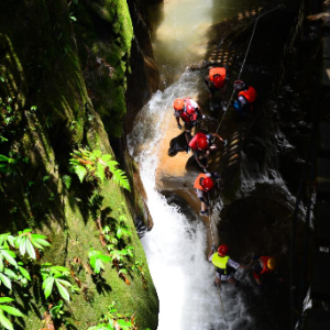 游客在金刀峡景区体验溪降。(秦廷富 摄)