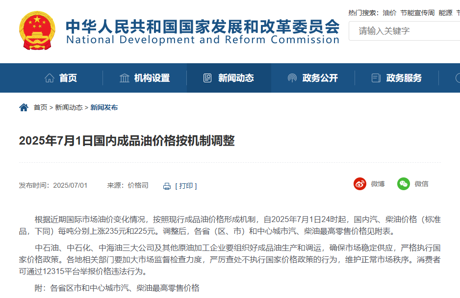 根据近期国际市场油价变化情况,按照现行成品油价格形成机制,自2025年7月1日24时起,国内汽、柴油价格(标准品,下同)每吨分别上涨235元和225元。调整后,各省(区、市)和中心城市汽、柴油最高零售价格见附表。