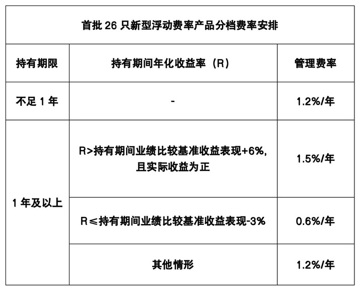 首批新型浮动费率基金产品均设置了1.2%(基准档)、1.5%(升档)、0.6%(降档)三档费率水平。投资者持有一年以后赎回产品时,基金管理人将会根据产品年化收益水平与业绩比较基准的对比情况,来计提不同档次的管理费。(记者刘慧)