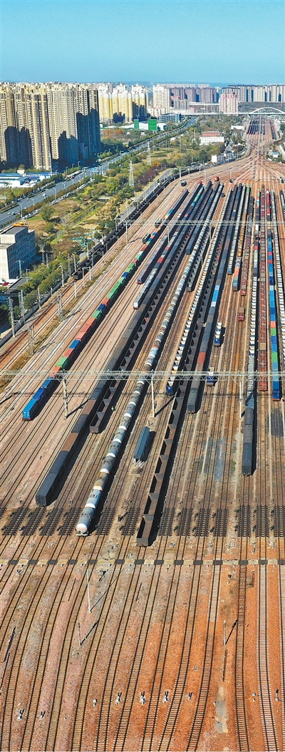 编组集结完成的货物列车在郑州北站有序排列。王玮 摄(影像中国)