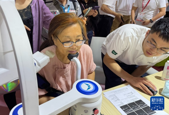 6月11日,一名参观者在2025上海国际养老、辅具及康复医疗博览会上体验颈动脉筛查机器人。新华社记者黄安琪摄
