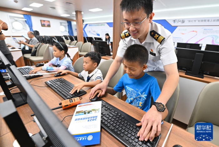 7月3日,小朋友在参观“新红专”轮智能船舶实训中心。新华社记者郭程摄